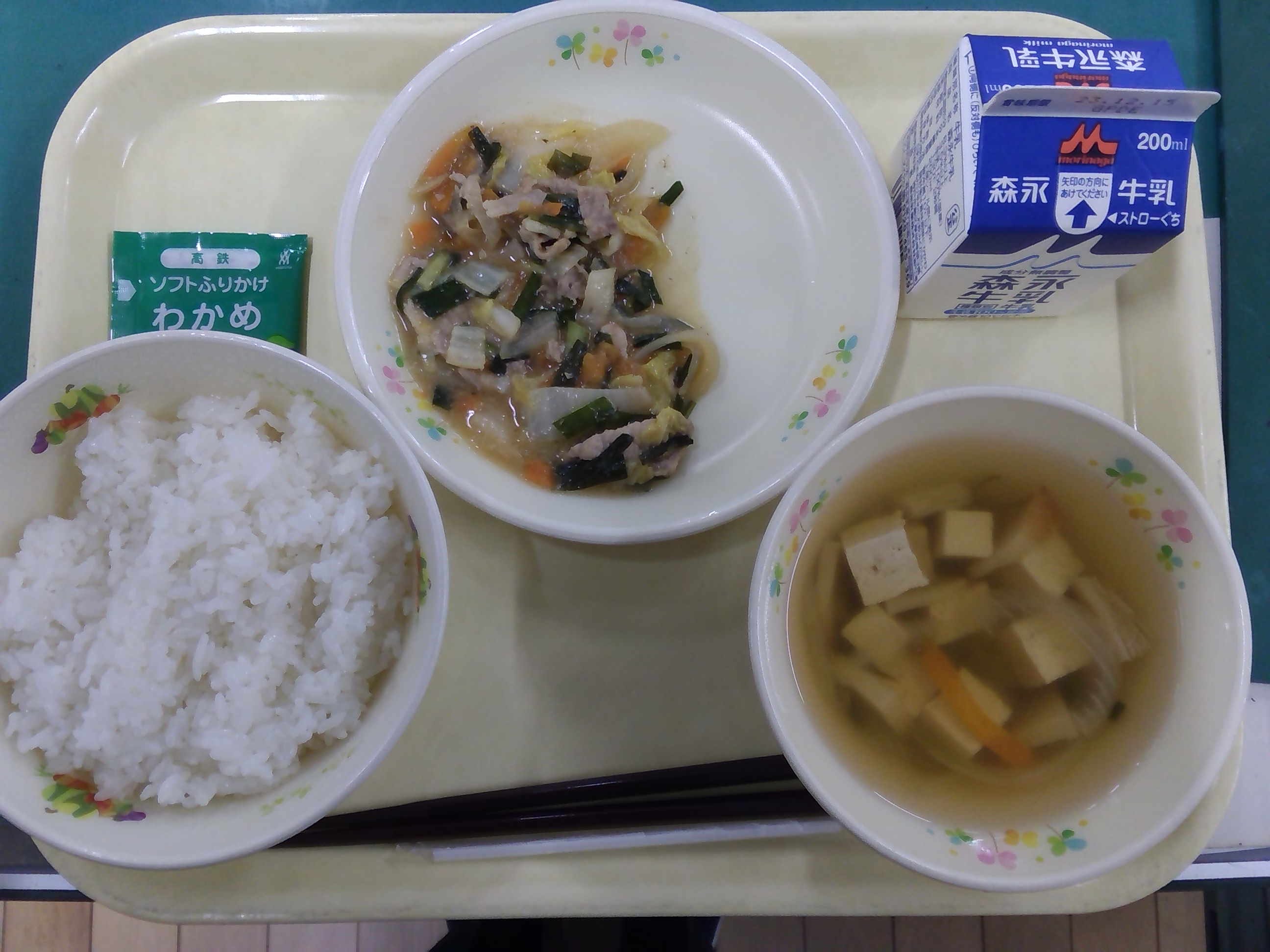 今日の献立は、ご飯、牛乳、豚肉と白菜のみそ炒め、すまし汁、ふりかけ(わかめ)です。